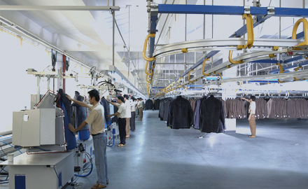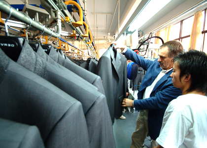 運用高品質的德國BRISAY立模整燙機,采用電腦控制蒸汽輸出量、溫度、壓力、定型、抽濕時間,根據面料的厚薄、質地、性能,以38種不同整燙程序調整以上各個參數,配合服裝的整燙。